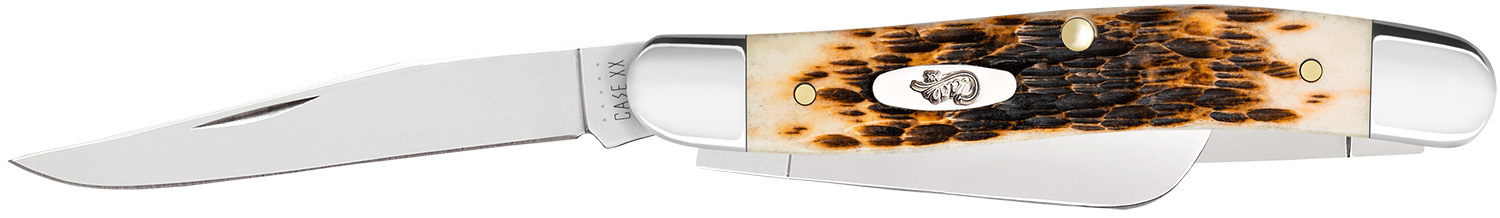 Case 00045 Peanut 2.10″/1.53″ Folding Clip Point/Pen Plain Mirror Polished Tru-Sharp SS Blade, Peach Seed Jigged Amber Jigged Bone Handle