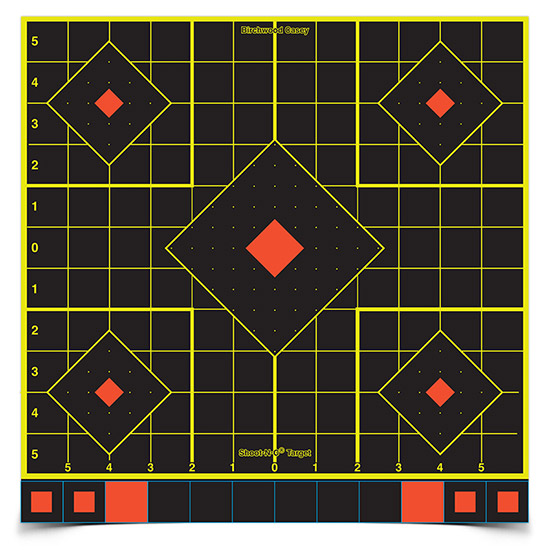 Bullet holes are revealed with bright chartreuse rings. – Self-adhesive backing makes targets easy to put up. – Convenient 1 numbered grid lines simplify scope adjustments. – Great for indoor or outdoor use and low-light conditions. – Five targets on each sheet use center target for sighting-in and four smaller targets for testing results of various ballistic loads or for confirmation of sight-in groups. Convenient 1 numbered grid lines simplify scope adjustments.