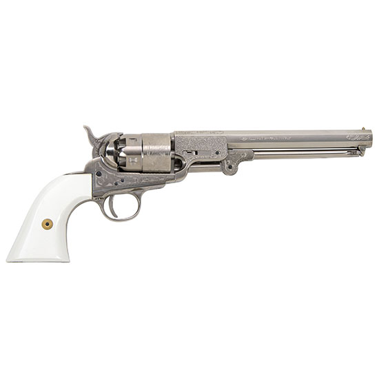 Union Army soldiers relied on many different types of sidearms for short range and close quarters combat. The revolver was unique in that it had the ability to fire several rounds per minute before having to reload. Revolvers were typically issued to officers and mounted soldiers however some were purchased privately or found on the battlefield by infantrymen. – Distinguished by its octagon barrel and lever style loader the 1851 helped to begin both the expansion of the West and the Civil War. The 1851 Navy is commonly considered to be one of gunfighter Wild Bill Hickok’s favorite handguns. The British government licensed the manufacturing rights and produced what is commonly known as the London Model. – This revolver features intricate engraving and a 7.375 octagonal barrel Nickel frame Nickel guard and Simulated Ivory grip. It is available in .44 caliber weighs 2.7 lbs. and is 13.5 in length. – .44 Caliber – Engraving – 7.375 Nickel Octagonal Barrel – Nickel Guard – Simulated Ivory Grip – Nickel Frame – Hammer/Blade Sights – Overall Length: 13.5 – Weighs 2.7 pounds