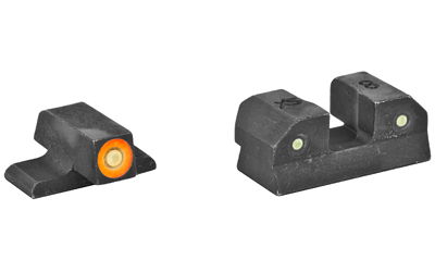 XS R3D Night Sights feature a traditional 3-dot tritium, notch and post sight picture. The blacked-out rear increases contrast against the front sight. The front sight is available in orange or green and is equipped with Ember(R) Glow Dot Technology. Ember absorbs ambient light and glows in low light. The front tritium lamp charges the Ember dot making the front sight glow brighter than the rear at all times, keeping focus downrange. R3D sights are the brightest notch and post option for fast and accurate shooting in bright and low light.